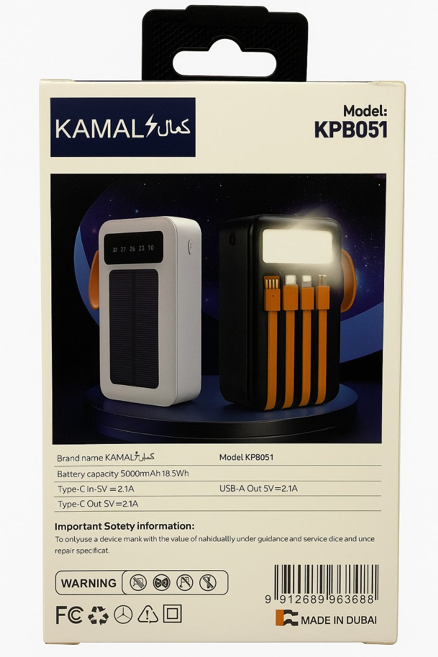 50000mAh Solar Power Bank – Fast Charging Portable Charger with LED Light & Built-in Cables | Type-C, Lightning, USB | Made in Dubai