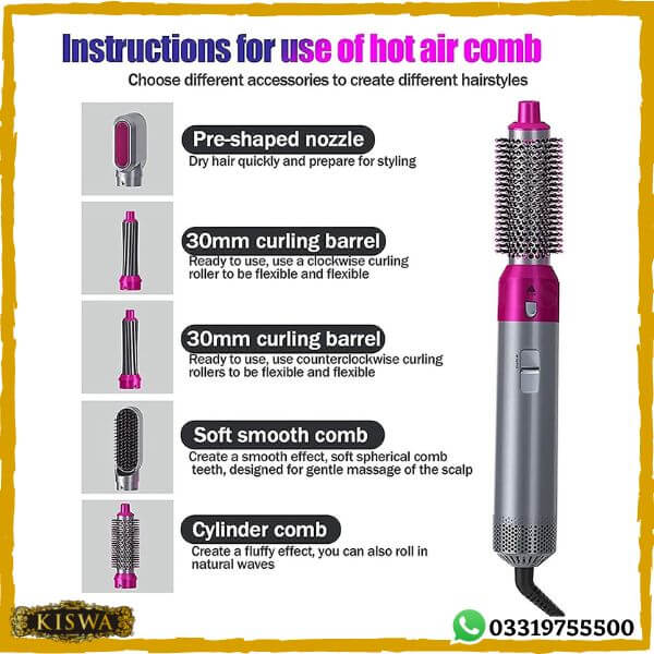Achieve salon-quality hair with our 5-in-1 Hot Air Brush designed for drying, volumizing, curling, straightening, and scalp massage. Featuring five interchangeable brush heads, 3 heat settings, and negative ion technology, this high-speed 1000W hair styler ensures frizz-free, long-lasting results. Made with heat-resistant ABS material, it delivers even heat distribution for quick drying and effortless styling. Lightweight, portable, and perfect for all hair types, this styling tool is ideal for travel, everyday use, and as a perfect gift for women and girls. 5-in-1 hair dryer brush, hot air brush, hair styler, volumizing, curling, straightening, frizz control, fast drying, salon-quality, professional hair tool, portable hair dryer